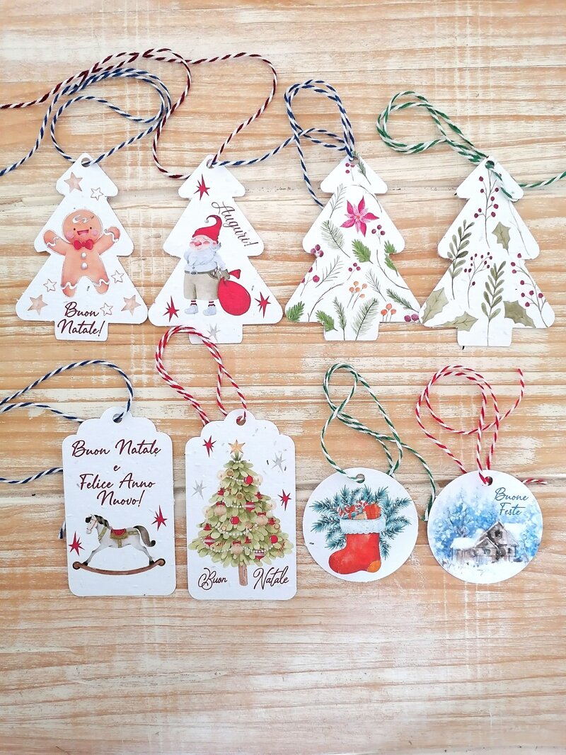 Kit composto da 8 cartellini chiudi pacco, realizzati in carta piantabile + spago + tag istruzioni